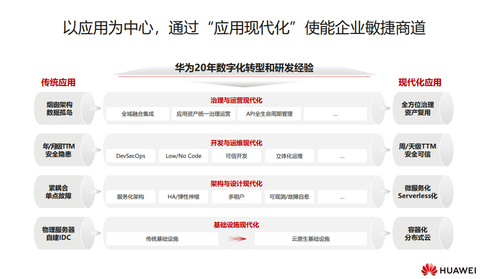 企业应用是企业数字化转型的关键,在各行各业加速数字化转型的大背景下,应用走向现代化是大势所趋。华为云依托华为公司20年数字化转型和研发的经验洞察到,以应用为中心,通过“应用现代化”,是使能企业实现敏捷商道的必由之路。