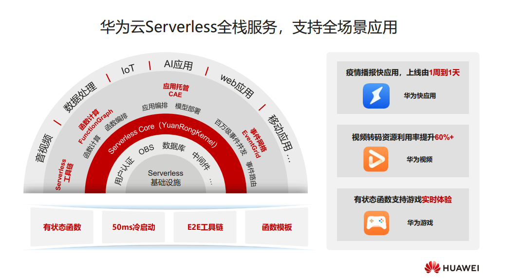 在这样的全栈服务能力布局及单项技术突破创新模式之下,华为云Serverless已经能够支撑从Web应用、移动应用、IoT应用到音视频、数据处理、AI应用的全场景应用场景。